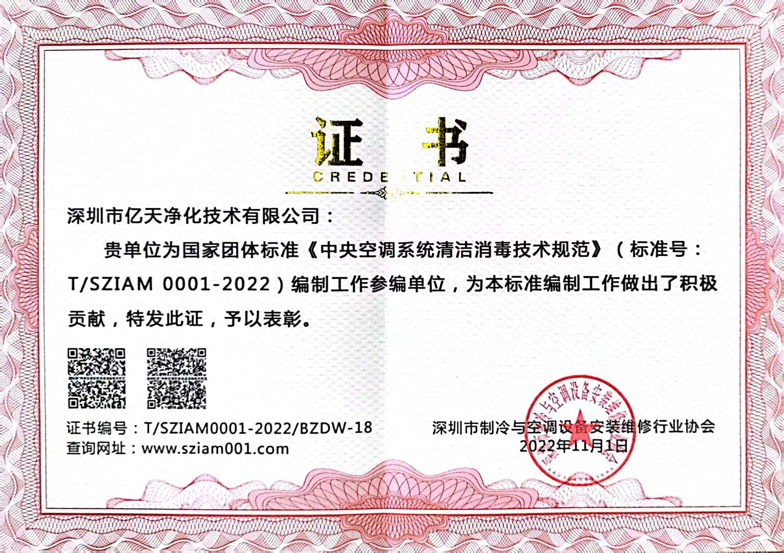 近日,由深圳市制冷與空調(diào)設(shè)備安裝維修行業(yè)協(xié)會(huì)(簡(jiǎn)稱深冷協(xié))主導(dǎo)發(fā)起、深圳市億天凈化技術(shù)有限公司參編的《中央空調(diào)系統(tǒng)清潔消毒技術(shù)規(guī)范》T/SZIAM0001-2022團(tuán)體標(biāo)準(zhǔn)正式發(fā)布實(shí)施。該標(biāo)準(zhǔn)主要對(duì)中央空調(diào)系統(tǒng)的清潔和消毒提出了一整套完整的專業(yè)技術(shù)規(guī)范、標(biāo)準(zhǔn)以及相關(guān)的具體操作流程、作業(yè)方法等,對(duì)中央空調(diào)系統(tǒng)乃至整個(gè)制冷行業(yè)的清潔消毒技術(shù)的發(fā)展具有非常重要的意義。